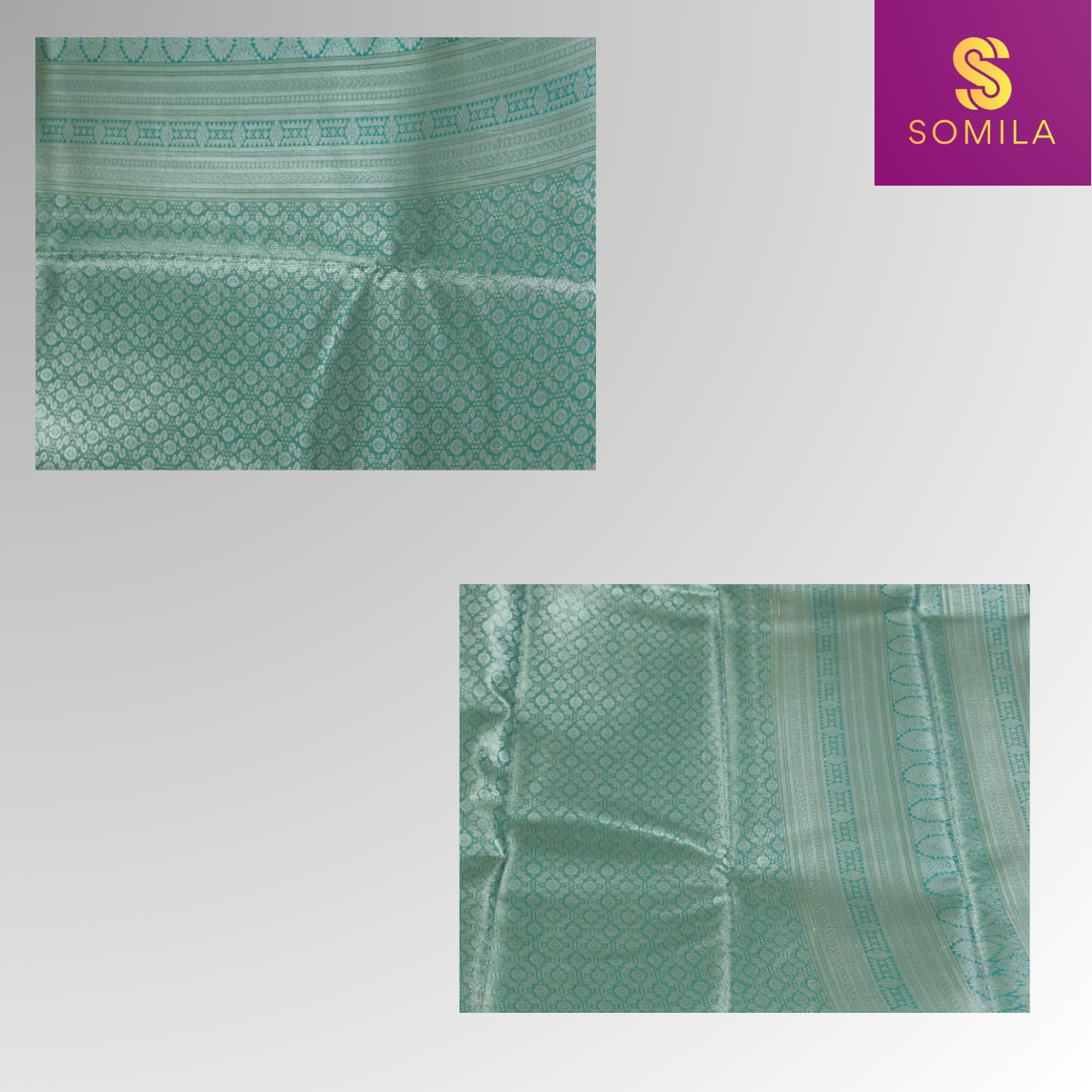 | The Finer Details | This saree is crafted from a semi silk blend that provides a beautiful structure and a subtle sheen. The Bronge Pastel body is adorned with a detailed floral brocade weave, while the wide teal blue border is heavily embellished with silver zari patterns, creating a look of sheer luxury. The pallu continues the intricate teal and silver design. | |
