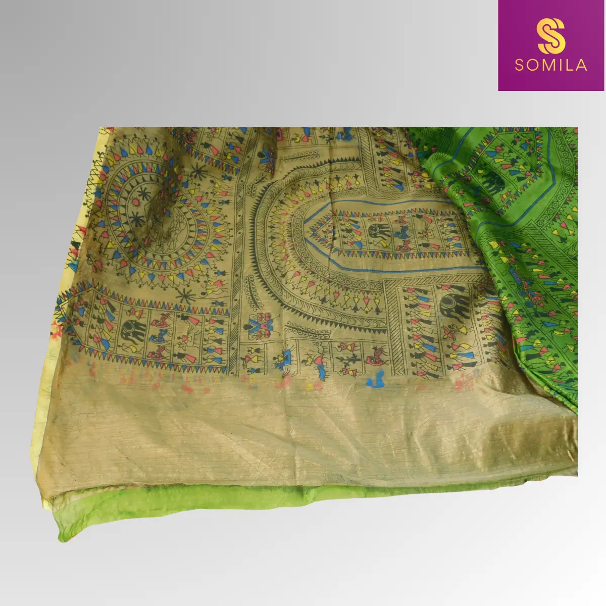 | Border & Pallu | The saree has a simple green border, and the pallu is heavily printed with colorful folk art motifs, finished with black tassels. | |