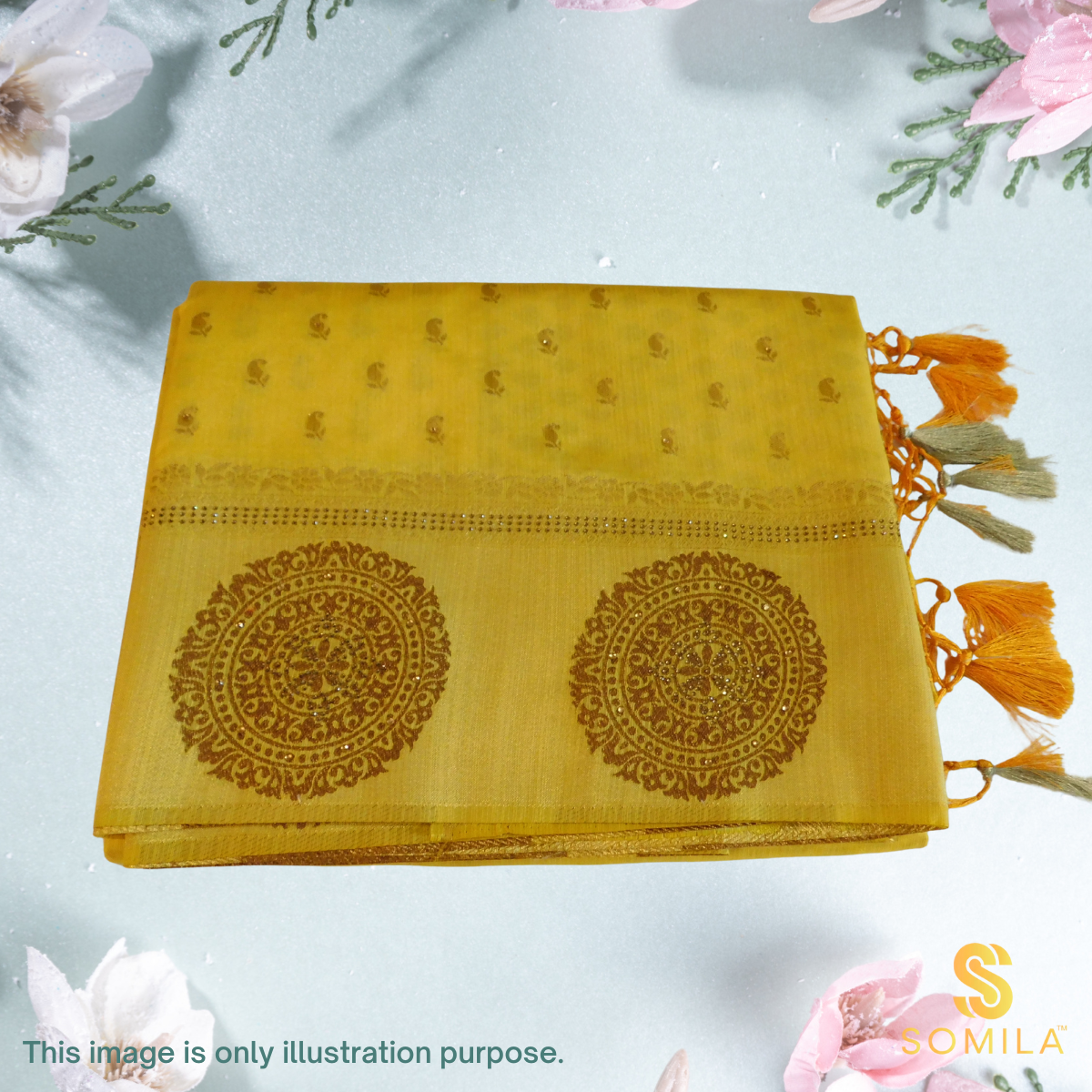 | Product Title | Mustard Gold Mulberry Silk Saree with Medallion Border & Contrast Tassels |