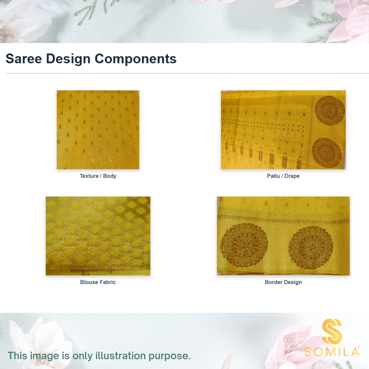 | Style & Suitability | Great for haldi events, daytime weddings, temple functions, and festive gatherings where warm gold tones stand out beautifully. Pair with antique gold jewelry or temple jewelry; a contrast blouse in bottle green or maroon can elevate the look further. |