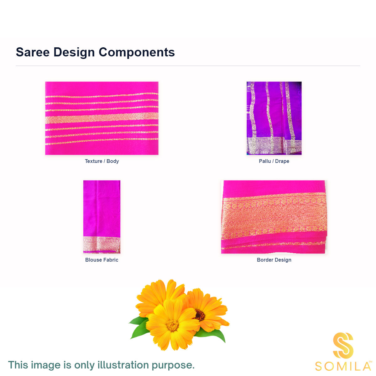 | Border & Pallu | The border is a broad gold zari band with a traditional floral/jaal-style weave that creates a rich frame. The pallu shifts slightly deeper (purple-plum) and features vertical zari stripe accents that look striking when worn over the shoulder. |