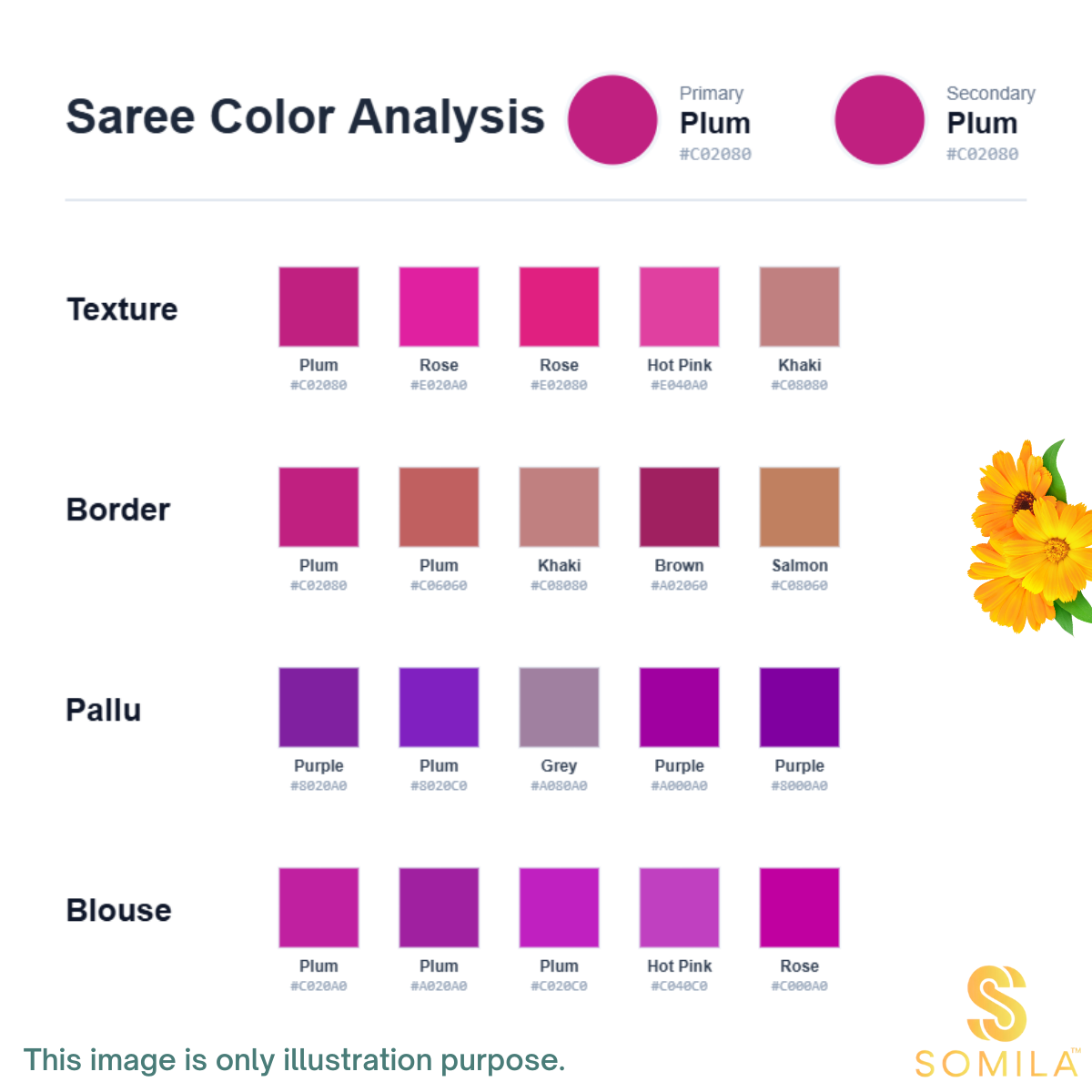 | Secondary Color(s) | Rose/hot pink tones, purple (pallu depth), gold zari, and subtle khaki/brown tones in the palette map |