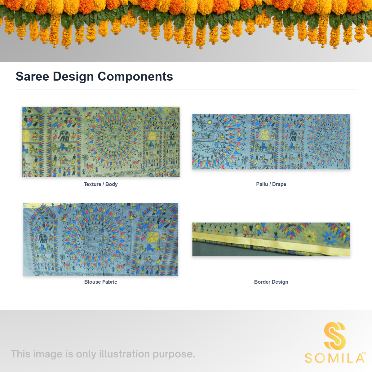 | The Story of the Saree | This saree feels like a wearable folk painting – soft sage-grey on the body, paired with a cooler steel-blue pallu that adds contrast without overpowering the look. Across the drape, detailed village-life motifs and a bold circular medallion create a narrative, making the saree both artistic and conversation-worthy. |