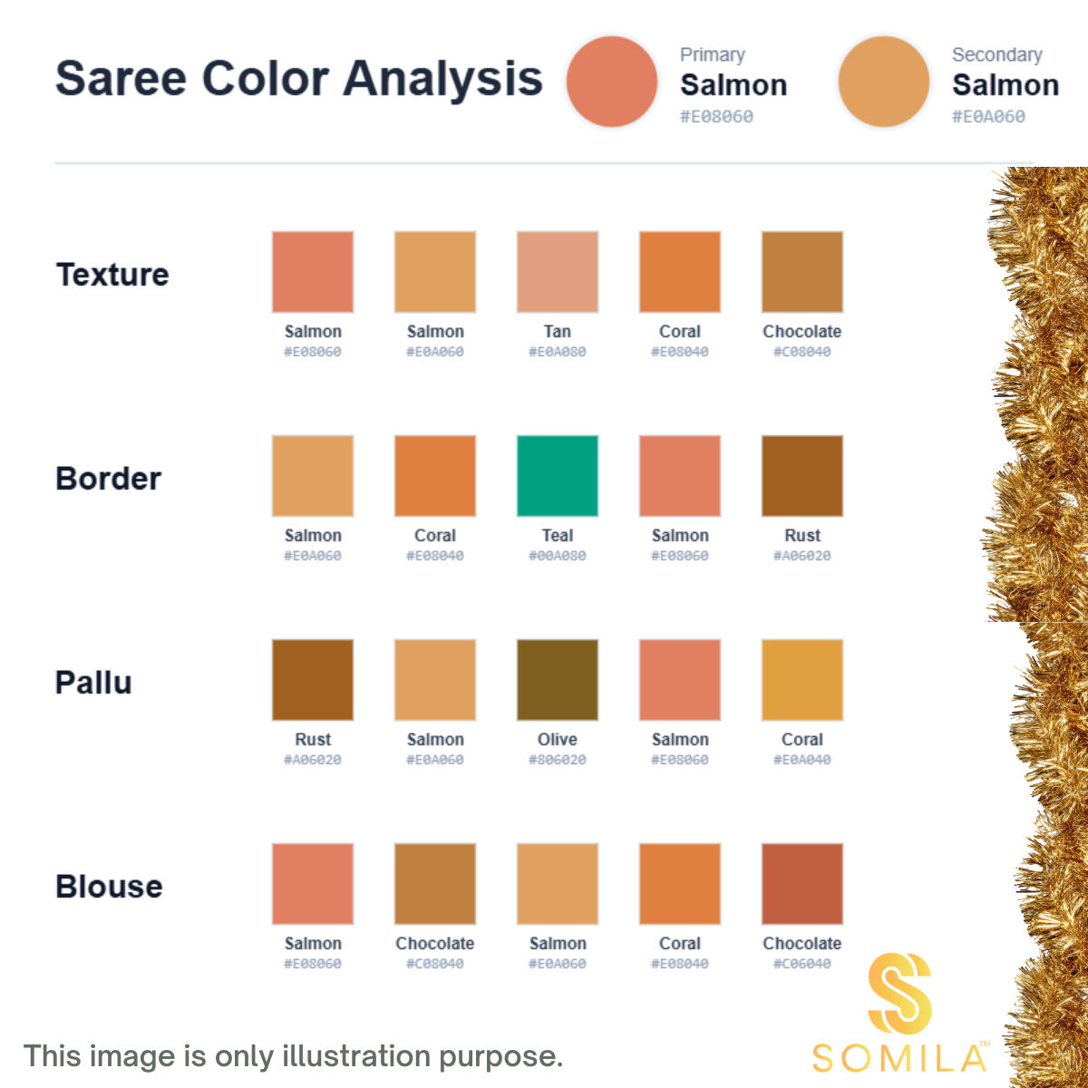| The Finer Details | The breathable cotton base keeps the saree cool and comfortable, while the zari and ikat accents add subtle richness without adding weight. The warm salmon and olive tones complement Indian skin tones and photograph beautifully in both indoor and outdoor light. |