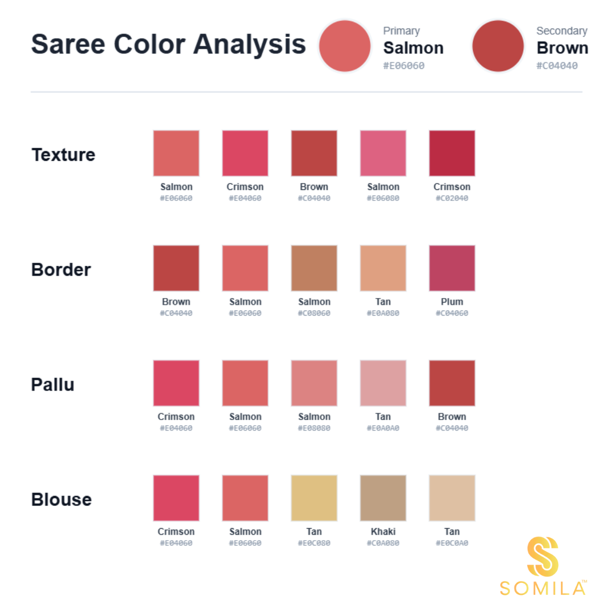 | Style & Suitability | Perfect for festivals, traditional functions, and wedding events where a classic yet contemporary saree is desired. Pairs beautifully with gold jewelry, temple pieces, or minimalist accessories, and suits a wide range of skin tones thanks to the warm salmon base. |