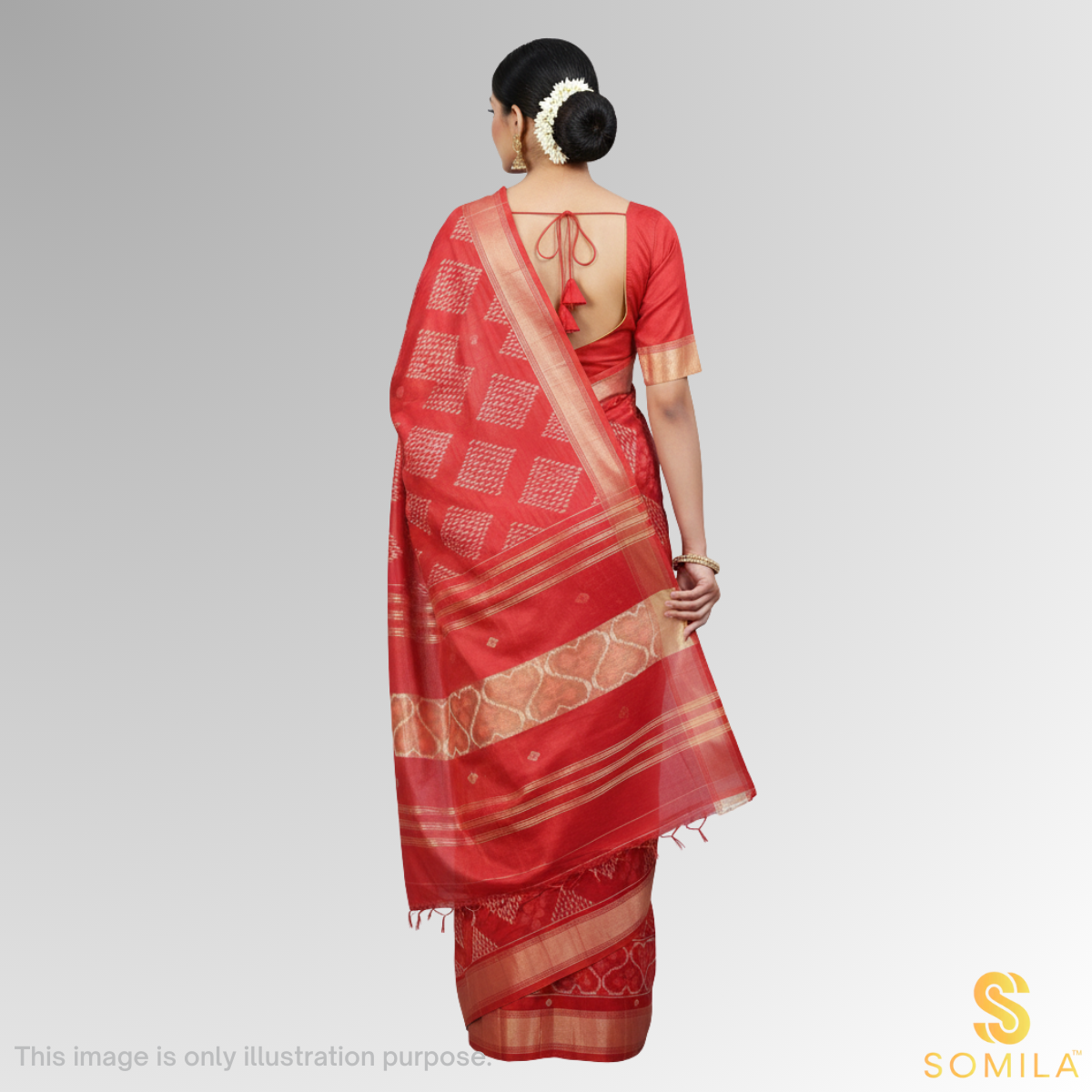| The Finer Details | The cotton silk-blend fabric gives a graceful, fluid fall while maintaining enough structure for neat pleats. The color palette is carefully graded so the saree reads as a rich red from afar, with nuanced salmon and tan details visible up close, ideal for photography and events. |