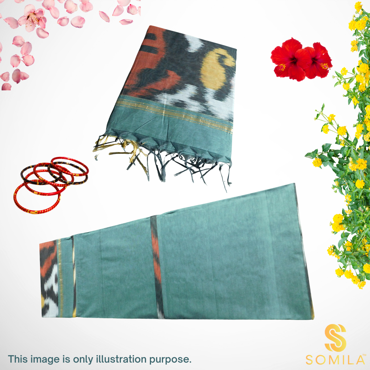 | Fabric | Pure cotton with woven ikat-style pallu and zari border accents |