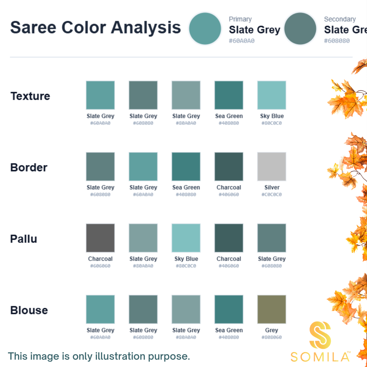 | Secondary Color(s) | Charcoal, sky blue, mustard, white, soft gold |