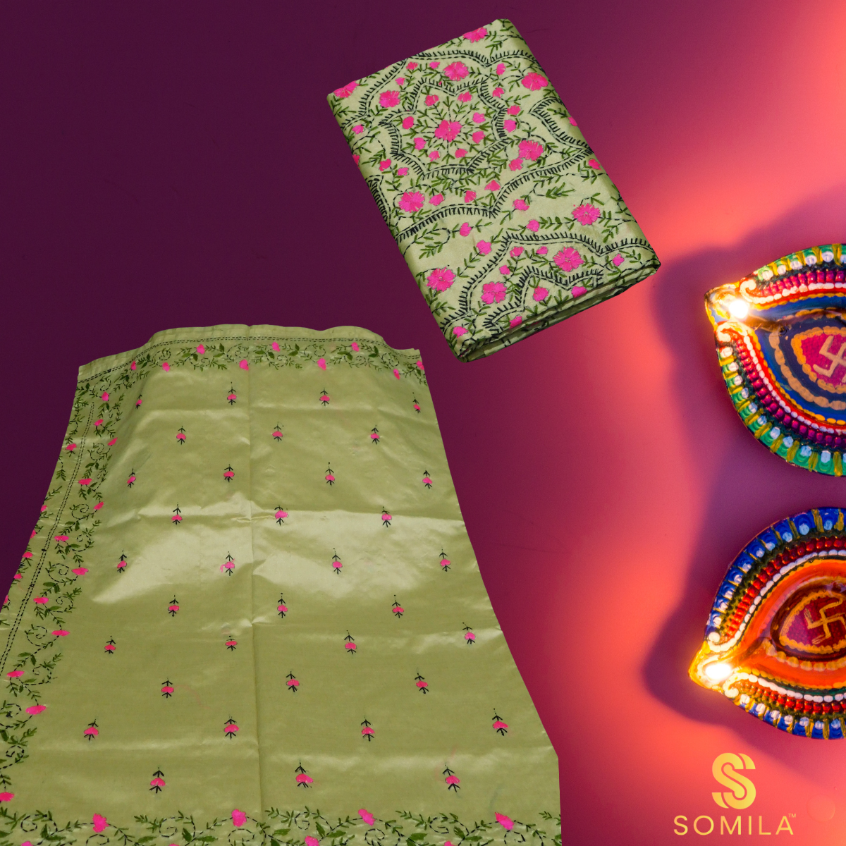 | The Story of the Saree | This soft pistachio green cotton saree blooms with vibrant hot pink floral embroidery, evoking a garden in full spring. Lightweight and graceful, it offers everyday comfort with the charm of detailed hand-style thread work, perfect for brightening any occasion. |