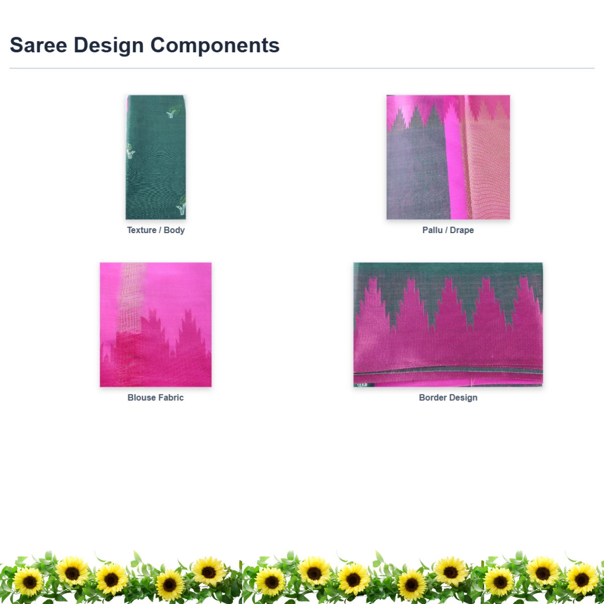 | The Artisan’s Touch / Craftsmanship & Heritage | The crisp leaf buttas and evenly spaced temple triangles reflect careful jacquard setting and color balancing. Each design element is placed to fall gracefully over the pleats and pallu, showcasing the weaver’s eye for proportion and traditional aesthetics in a contemporary color story. |